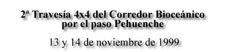 1ª Travesía y la presentación de la Segunda La noche del 15 de agosto de 1998 en Malargüe, Mendoza, el grupo de 34 hombres que habíamos concluido el recorrido "De La Pampa al Pehuenche" improvisamos junto al intendente Celso Jaques de esa localidad, un documento en el cual se dejaba constancia de haber "concluido exitosamente con el objetivo propuesto de transitar el corredor bioceánico" y nacía el compromiso de "seguir trabajando" hasta alcanzar su concreción definitiva. Era la conclusión de la "1ra Travesía" y con ella, el nacimiento de una nueva manera de realizar propuestas. La idea de continuar con esta modalidad año tras año, hasta lograr la pavimentación de los tramos faltantes del Corredor Bioceánico, fue casi un pacto que nadie tomó en menos. Luego, con el paso del tiempo y la profundización del conocimiento en cuanto a la importancia económica, social y cultural de lograr la concreción de un corredor vial que atravesando nuestra provincia, conecte ambos océanos y beneficie a toda una región integrada por el oeste bonaerense, La Pampa, el sur mendocino y la VII Región chilena, muchos más fueron los entusiastas que quisieron formar parte de este acontecimiento. La participación de los medios de difusión en esta "2da Travesía del Corredor Bioceánico por el Paso Pehuenche", sumó también un importante apoyo y algunos, como el Canal 3 Satelital, FM Contacto 104.3 y LU 33 Emisora Pampeana nos acompañaron durante el recorrido. |