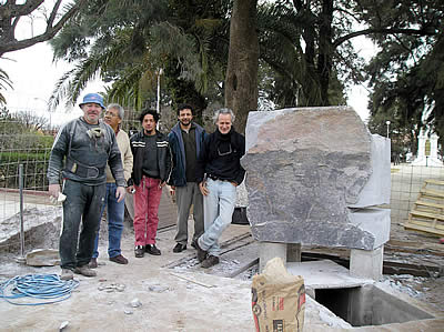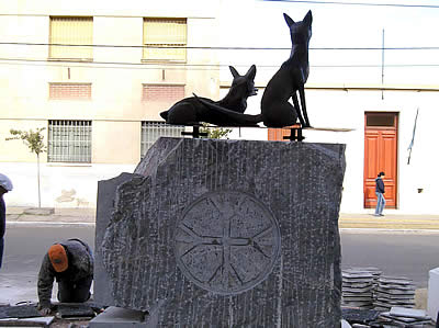 Sobre la piedra tallada por Raúl Fernández Olivi, la escultura de los zorros, realizada por Ruben Schaab y Marcelo Pifarré. |