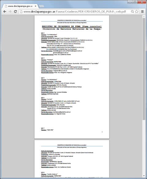 Asumimos que esta información era así, luego de investigar en el archivo “Registro de Criaderos de Puma” de la página Web de la Dirección de Recursos Naturales, cuyo link es: