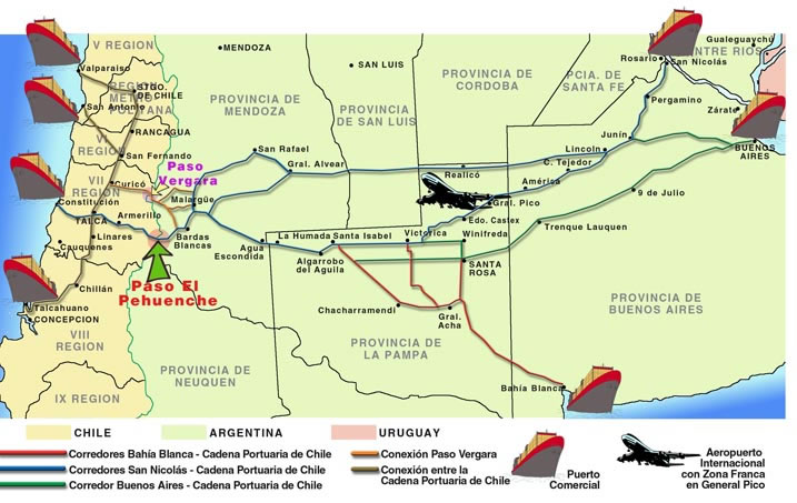 Las dos lineas mayores son unir la cadena portuaria de Chile (Valparaiso, San Antonio, Constitución y Talcahuano) a partir del ingreso por Talca, con los puertos argentinos de San Nicolás-Rosario y el de aguas profundas de Bahía Banca, en ambos casos atravesando la provincia de La Pampa y de allí nuestro interés en el tema.