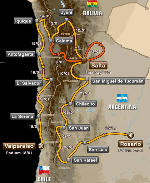 El día 13 la carrera parte nuevamente desde Salta y vuelve a cruzar otra frontera, esta vez la Cordillera de los Andes, para alcanzar la ciudad chilena de Calama, país donde se queda el rally hasta el final.