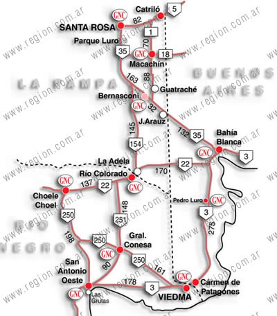 La distancia entre Santa Rosa, por ejemplo, y el balneario Las Grutas que pertenece al municipio de San Antonio Oeste, es de 510 km sin peajes. El camino es bueno, salvo la contrariedad de que hace muchos años la Ruta Nacional Nº 154 antes de llegar al cruce con la RN Nº 22, sigue teniendo, inexplicablemente, un pequeño tramo de ripio sin asfaltar.