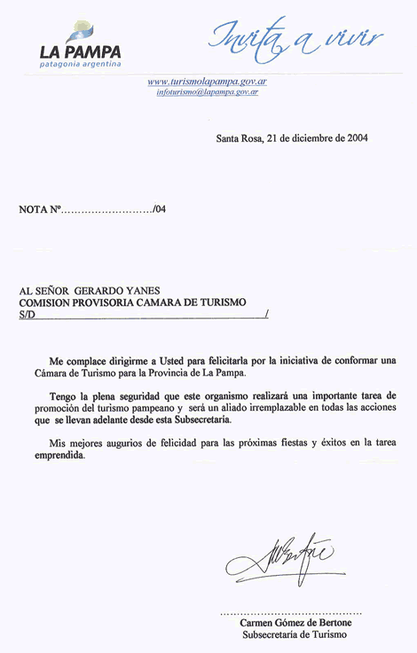 En la nota de fecha 21 de diciembre señala: «Tengo la plena seguridad que este organismo realizará una importante tarea de promoción del turismo pampeano y será un aliado irreemplazable en todas las acciones que se llevan adelante desde ésta Subsecretaría» deseando luego éxitos en la tarea emprendida.