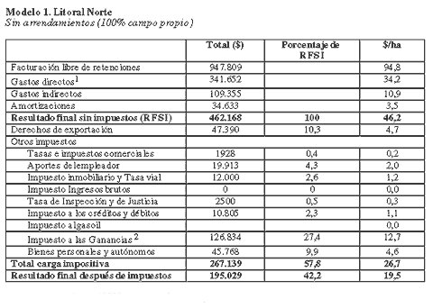 De ahí surge que la presión impositiva actual del sector agropecuario se encuentra entre el 58% y el 103% del Resultado Final Sin Impuestos de las empresas. Con la expectativa de precios de mediados de febrero de 2005 (precios futuros a cosecha), en los planteos con tierra arrendada, la carga fiscal supera el 100% del resultado en algunos casos y los beneficios pueden no llegar a cubrir el costo del capital.