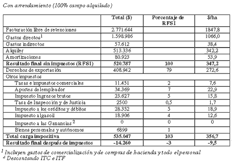 Como en este modelo parte de la producción es agrícola, el peso de las retenciones sobre el RFSI es mayor que en el modelo anterior, dado que las exportaciones de cereales y oleaginosas se encuentran gravadas con mayores alícuotas que las de la carne. También se incrementa la participación de los Derechos de Exportación como porcentaje del total de impuestos pagados, pasando a representar el 56% de los mismos Si se evalúa esta misma explotación pero 100% alquilada (se consideró un valor de arrendamiento de 8 qq de soja por hectárea), la carga impositiva asciende al 103%, con lo cual llevaría al negocio a obtener una renta negativa de 9,5 $/ha. Los derechos de exportación llegan a representar el 77% de los impuestos pagados.