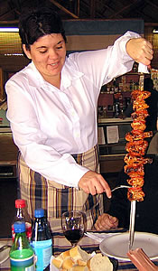 El plato principal de los domingos y feriados lo constituye el tradicional asado al asador, hecho a la vista bajo un centenario caldén que hace de vigía de la tradición más encumbrada -y famosa- de la gastronomía local. |