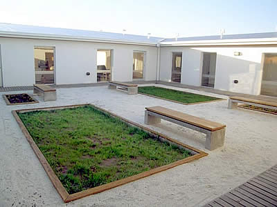 El conjunto posee una arquitectura sencilla , de volúmenes bajos y agradables. En relación con su entorno se abre hacia la buena orientación y hacia los médanos vecinos. En oposición y como complemento el patio interior otorga protección y reparo. Constructivamente el edificio responderá a esta concepción y utilizará recursos sencillos y de bajo mantenimiento. Muros cerámicos portantes revocados y pintados, carpinterías de aluminio anodizado natural y cubiertas metálicas, pisos y revestimientos cerámicos etc.
