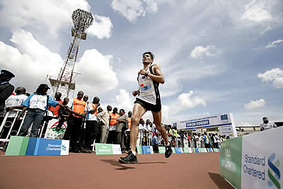 El pampeano Alejandro Giménez llega a la meta del Maratón de Nairobi, corrido el pasado domingo 29 de octubre. Fue el mejor latinoamericano clasificado, posición que lo catapulta a las próximas competencias internacionales. (Foto Standad Chartered Bank) |