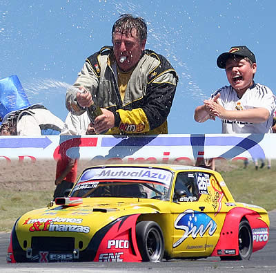 El festejo del campeón en la última carrera del año y el Ford ganador en el autódromo santarroseño. |