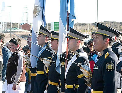 Una numerosa concurrencia se dió cita frente al nuevo edificio comunal, donde el cuerpo de cadetes de segundo año del Instituto de Formación Policial de La Pampa (foto), prestó juramento de fidelidad a la Bandera Nacional, acompañados por una delegación de alumnos de la Escuela Hogar Nº 170 de Colonia Roldán, provincia de Río Negro.