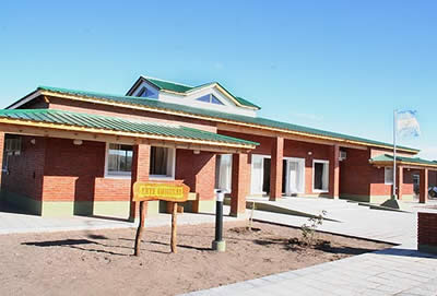 Ente Comunal Casa de Piedra, más de 700 metros cuadrados con paredes de ladrillos rasados vistos, techos tipo chalets de chapa verde y amplias aberturas con vista al lago. |