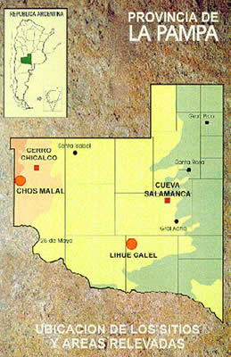 Provincia de La Pampa. Ubicación de los sitios y áreas relevadas con Arte Rupestre entre 1975 y 1977. |