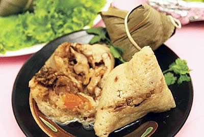 7. Zong-zhi: Tamales chinos hechos de arroz glutinoso, rellenos de carne, nueces y setas. Se sirven envueltos en hojas de bambú. Este xiaochi no es exclusivo de la temporada veraniega, aunque su consumo llega al apogeo durante el Festival de los Botes Dragón. Todo el año se puede disfrutar de sus diversas variedades; por ejemplo, el relleno de carne puede variarse por huevo de pato. También hay versiones dulces, con arroz negro y semillas de loto.