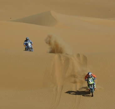 Con 6 motos encararon los duros terrenos de salar, piedras y dunas bajas con arbustos, pero de una consistencia muy blanda que hacia una conducción muy complicada, ya que las motos se enterraban con facilidad. Luego continuaron por caminos rápidos de ripio, que alcanzaban una altura de 4.700 metros sobre el nivel del mar.