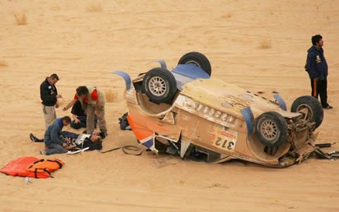 En 1979, la primera edición del Dakar ya era una realidad, pero el 14 de enero de 1986, un helicóptero de la organización, donde viajaba el creador y organizador de esa tremenda aventura, se estrelló contra una duna de 30 metros de altura, estallando en mil pedazos, y muriendo sus 5 ocupantes en el acto (foto). Como vemos, en la historia de los accidentes del Dakar no han sido víctimas sólo los corredores.