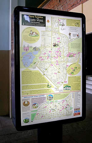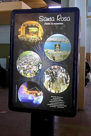 Desde hace unos días, la Terminal de Omnibus de la ciudad de Santa Rosa, muestra cartelería informativa actualizada para los miles de pasajeros que diariamente pasan por alli. Como puede verse, la Dirección de Turismo Municipal ha hecho renovar el plano céntrico turístico de la capital pampeana, con un diseño más moderno y mayores datos orientativos de sitios para visitar.