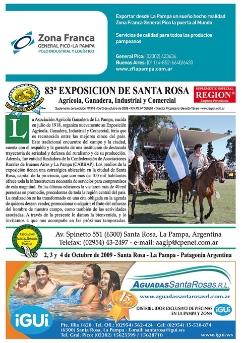 Con la entrada en Boleterías, no olvide reclamar este fin de semana el suplemento color del Programa de Actividades con la Nómina de Stands por Rubros de la 83ª Exposición Agrícola, Ganadera, Industrial y Comercial, que organiza la Asociación Agrícola Ganadera de La Pampa en Santa Rosa.