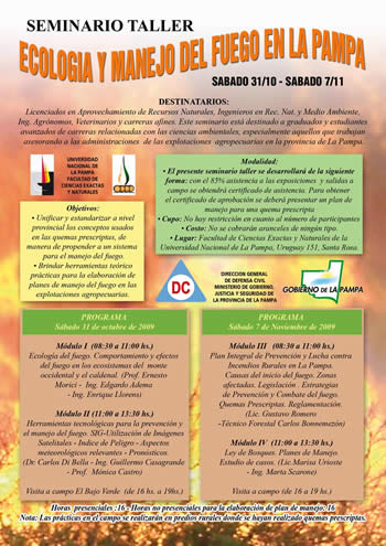 Sábado 31/10: Módulo I (08:30 a 11:00 hs.) Ecología del fuego. Comportamiento y efectos del fuego en los ecosistemas del monte occidental y el caldenal. (Prof. Ernesto Morici - Ing. Edgardo Adema - Ing. Enrique Llorens).