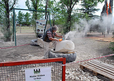 El artista riojano trabaja sobre “una piedra de la zona, es un mármol travertino muy joven y la idea surgió un poco aquí, porque vine con una idea diferente y como descubrí que esta piedra fue extraída del centro de la provincia y esto fue antiguamente un mar, cuando uno empieza a picar la piedra se da cuenta por los restos fósiles que tiene, que en algún momento estuvo en el mar, por lo que la idea que yo tengo ahora es hacer una especie de ola sobre una gran piedra, de manera que sería una gran ola sobre el mar dedicada por supuesto a La Pampa”.
