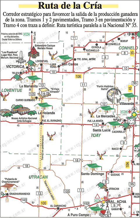 Por otra parte, en la zona del paraje «El Durazno», se construyó un galpón con fosa de grandes dimensiones (20 metros por 30 metros) el que será utilizado como depósito de Vialidad y talleres de reparación y mantenimiento de maquinarias y casillas, por lo que se destacará en el lugar un asentamiento de personal vial. Este segmento de la Ruta de la Cría es continuación de los dos primeros ya realizados, que se extienden entre Victorica y Carro Quemado y desde las proximidades de esa población hasta la ruta Nº 14.