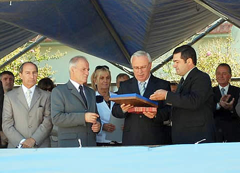 En primer lugar se llevó a cabo un descubrimiento de placas en el edificio municipal en relación a los 100 años de la localidad, seguidamente se entregaron presentes; el intendente entregó al vicegobernador la llave de la ciudad, posteriormente Campo hizo entrega al Jefe Comunal de un presente en nombre del Gobierno Provincial para luego hacer entrega de reconocimientos a quienes fueron presidentes de la Comisión de Fomento e Intendente de la localidad, a antiguos pobladores, a la Sra. Liliana Cazenave ganadora del concurso del logotipo del centenario y a la ex docente Estela Lucero.