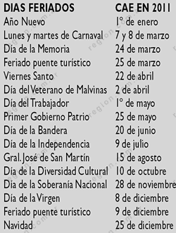 Como ya lo habíamos anticipado, en 2011 habrá 17 feriados (ver almanaque de REGION®).