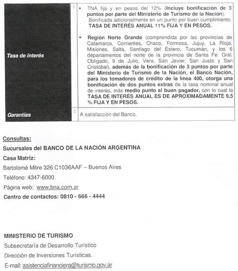 El Banco Nación, además otorga para los tomadores de crédito de la línea 400, de la región Norte Grande, una bonificación de dos puntos extras de la tasa nominal anual de interés, más medio punto al buen pagador, a lo cual se les suman los tres puntos bonificados por el MINTUR con lo cual acceden a una tasa de interés de 9,5 % fija y en pesos.