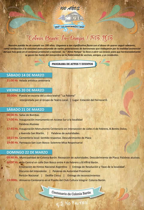 10 hs: Acto Central en calle Don Bosco entre 4 de Febrero y B. Vilfrid Barón. Entonación del Himno Nacional Argentino. Entrega de Resolución y “llave de la localidad”