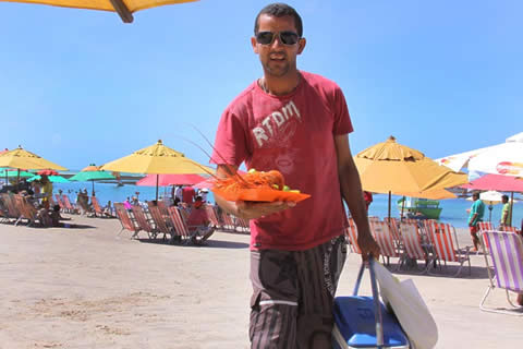 Un vendedor de playa nos ofrece langostas frescas, una oferta imposible de rechazar. Fue durante una de nuestras visitas a Porto de Galinhas. Ver más en REGION® Nº 959.