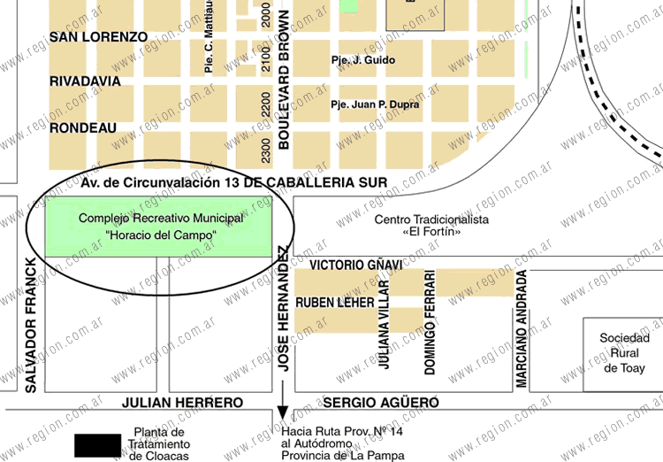 Ubicación del Parque Municipal “Horacio Del Campo” en Toay, donde será el nuevo emplazamiento del vivac-campamento del Rally CaNav